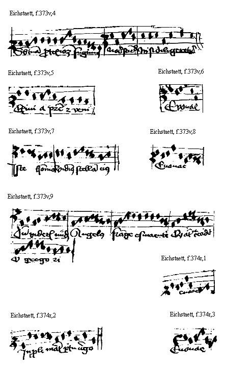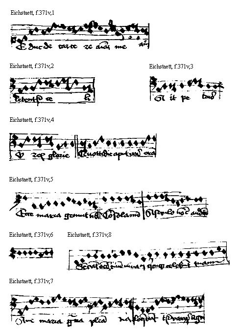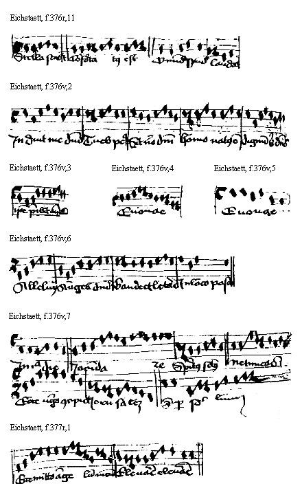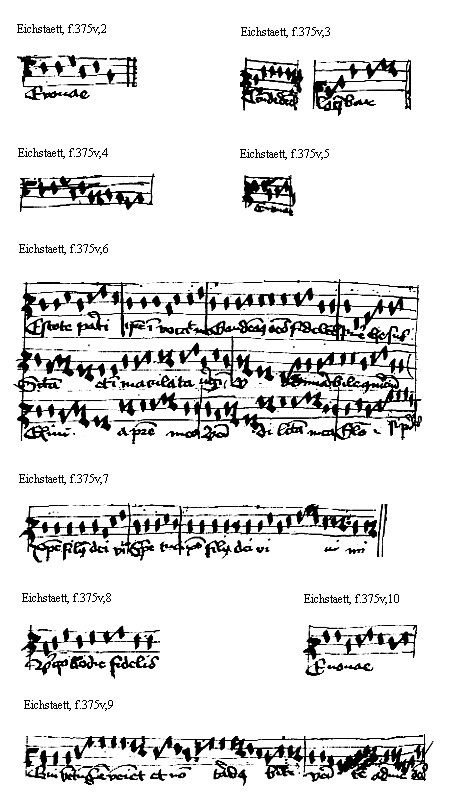 [Eichstaett, f.375v,6; text: Estote parati, Ipse inuocat me, Gaudeamus omnes fideles, Puer Ihesus, Sancta et immaculata virginitas, O admirabile commercium, Exiui a patre meo, Veni dilecta mea, Gloriosi principes]