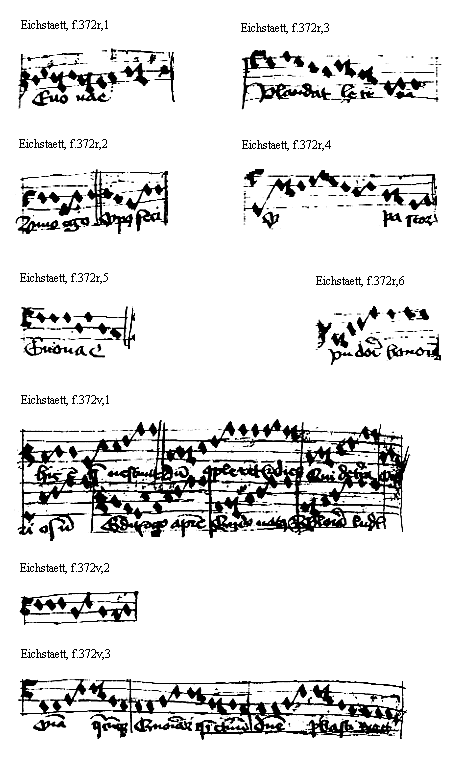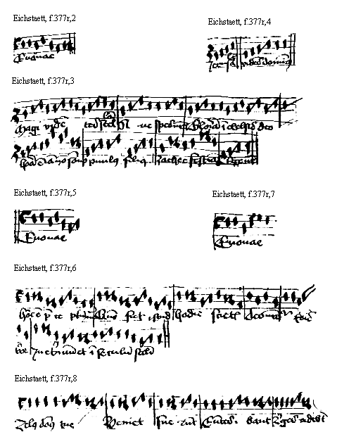 [Eichstaett, f.377r,3; text: Magi videntes stellam, Aue spes nostra, Gloria in exelsis deo, Hora est iam nos somno, Paruulus filius, Zachee festinans, Ecce uir]