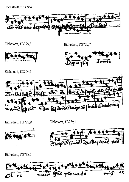 [Eichstaett, f.375r,4; text: Castus mente corpore, Alma redemtoris, Omnis vallis implebitur, Voce cordis]