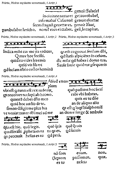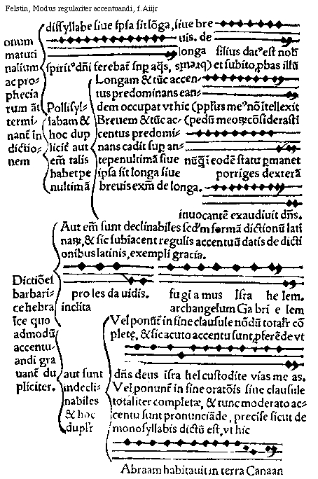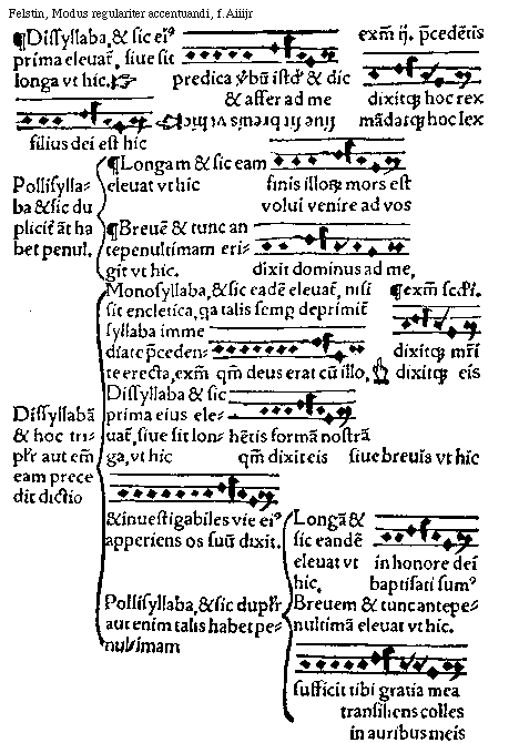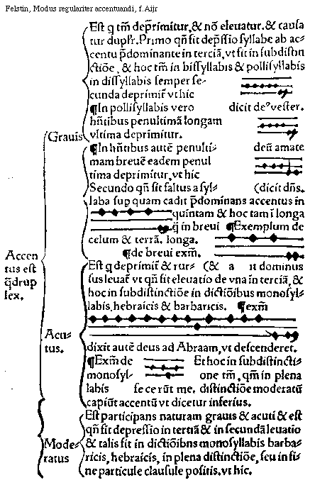 [f.Aijr][Felstin, Modus regulariter accentuandi, f.Aijr; text: Accentus est quadruplex. Grauis Est qui tantum deprimitur, et non eleuatur. Et causatur dupliciter. Primo quando fit depressio syllabe ab accentu predominante in terciam, vt fit in subdistinctione, et hoc tantum in bissyllabis et pollisyllabis, in dissyllabis semper secunda deprimitur vt hic, dicit deus vester. In pollisyllabis vero habentibus penultimam longam vltima deprimitur. deum amate. In habentibus autem penultimam breuem eadem penultima deprimitur, vt hic, dicit dominus. Secundo quando fit saltus a syllaba super quam cadit predominans accentus in quintam et hoc tam in longa quam in breui, Exemplum de longa. celum et terram. de breui exemplum, et ait dominus, Acutus Est qui deprimitur et rursus leuatur vt quando fit eleuatio de vna in terciam, et hoc in subdistinctione in dictionibus monosyllabis hebraicis et barbaricis. exemplum, dixit autem deus ad Abraam, vt descenderet. Exemplum de monosyllabis, fecerunt me. Et hoc in subdistinctione tantum, quantum in plena distinctione moderatum capiunt accentum vt dicetur inferius. Moderatus Est participans naturam grauis et acuti et est quando fit depressio in tertiam et in secundam leuatio et talis fit in dictionibns monosyllabis barbaricis, hebraicis, in plena distinctione, seu in fine particule clausule positis, vt hic.]