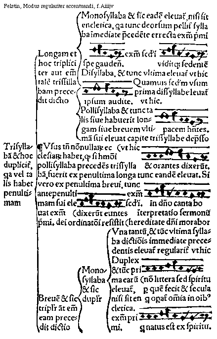 [f.Aiiijv][Felstin, Modus regulariter accentuandi, f.Aiiijv; text: Trisyllabam, et hoc dupliciter, quia vel talis habet penultimam Longam et hoc tripliciter aut enim talem trissillabam precedit dictio Monosyllaba et sic eadem eleuatur, nisi sit encletica, quia tunc deorsum pellitur syllaba immediate precedente errecta, exemplum primi, spe gaudens. exemplum secundi, viditque sedentem, Dissyllaba, et tunc vltima eleuatur vt hic, ipsum audite. Quamuis secundum vsum prima dissyllabe leuatur vt hic. pacem habentes. Pollisyllaba et tunc talis siue habuerit longam siue breuem vltimam sui eleuat capite trissyllabe depresso vt hic et orantes dixerunt. Vsus tamen nonnullarum ecclesiarum habet, quod si huiusmodi pollisyllaba precedens trissyllabam, fuerit ex penultima longa tunc eandem eleuat. Si vero ex penultima breui, tunc antepenultimam sui eleuat, exemplum primi. dixerunt euntes, dei ordinationi resistit, exemplum secundi. in domino cantabo, interpretatio sermonum, hereditate domini morabor. Breuem et sic tripliciter aut enim eam precedit dictio, Monosyllaba et sic dupliciter, Vna tantum, et tunc vltima syllaba dictionis immediate precedentis eleuatur regulariter vt hic, non littera sed spiritu per quem fecit et secula qui operatur omnia in omnibus, Duplex et tunc prima earum eleuatur, nisi sit encletica. exemplum primi. qui natus est ex spiritu.]