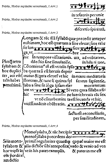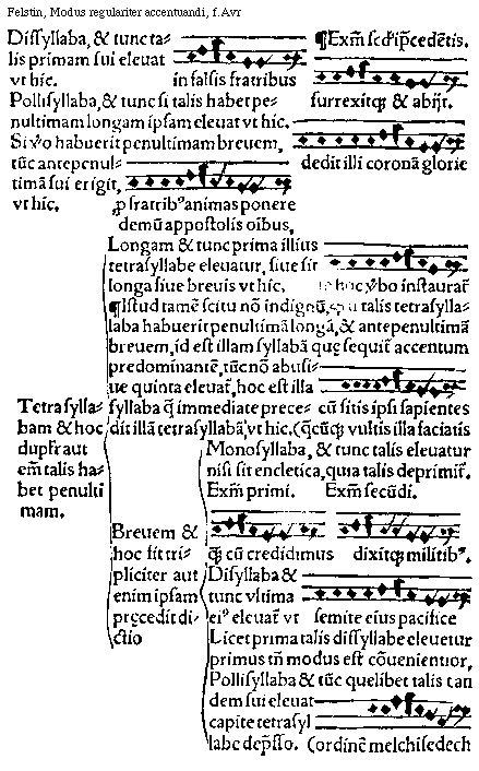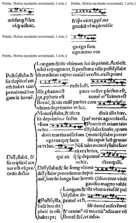 [Felstin, Modus regulariter accentuandi, f.Aiijv,5; text: Monosyllabam et hoc dupliciter aut In vnam et hoc dupliciter aut eam precedit dictio Dissyllaba et tunc prima illius disyllabe eleuatur, siue sit longa siue breuis de longa exemplum, scriptum est, mendax est, de breui exemplum, non querit quae sua sunt, mea est, Pollisyllaba et sic talis si habet penultimam longam ipsam erigit vt hic, nomen eius Ioannes est. Si vero habuerit breuem penultimam tunc antepenultimam sui eleuat, vt, deus charitas est, In duas, et sic tripliciter aut enim ipsam precedit dictio, Monosyllaba et tunc eadem tercia debet eleuari nisi sit encletica quia talis deprimitur, syllaba immediate precedente erecta, exemplum primi, gratia dei sum id quod sum aduersus huiusmodi non est lex]