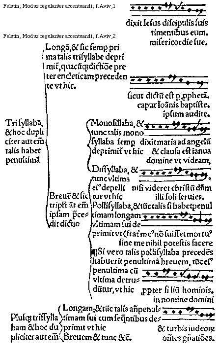 [Felstin, Modus regulariter accentuandi, f.Aijv,3; text: Omnis clausula lectionum, Monosyllabam et hoc dupliciter, aut enim talis monosyllaba ponitur. In fine orationis siue clausule nondum totaliter completae quo ad perfectionem, sicut communiter fit in subdistinctionibus, et tunc talis dictio monosyllaba acuto accentu est pronuncianda vt patet in his et in similibus exemplis vt, Manus tue domine fecerunt me, infernus domus mea est, In fine orationis siue sententie totaliter complete vt fit in plena distinctione, et tunc talis monosillaba moderato accentu pronuncianda est vt, numerns mensium apud te est, et exaudisti me, Excipiuntur tamen dictiones encletice, scilicet, que, ne, ue, quae non moderato sed graui accentu proferuntur vt hic, dixit que, putasne, dominusue. Disyllabam, et tunc accentus principalis sempet cadit supra primam syllabam illius dictionis]