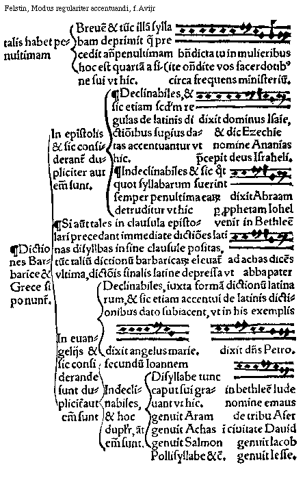 [f.Avijr][Felstin, Modus regulariter accentuandi, f.Avijr; text: talis habet penultimam Breuem et tunc illam syllabam deprimit quae precedit antepenultimam hoc est quartam a fine sui vt hic. benedicta tu in mulieribus, ite ostendite vos sacerdotibus, circa frequens ministerium. Dictiones Barbarice et Grece si ponuntur. In epistolis et sic considerantur dupliciter aut enim sunt. Declinabiles, et sic etiam secundum regulas de latinis dictionibus superius datas accentuantur vt hic, dixit dominus Isaie, et dic Ezechie, nomine Ananias, precepit deus Israheli. Indeclinabiles et sic quotquot syllabarum fuerint semper penultima earum detruditur vt hic, dixit Abraam, per prophetam Iohel, venit in Bethleem, Si autem tales in clausula epistolari precedant immediate dictiones latinas disyllabas in fine clausule positas, tunc talium dictionum barbaricarum eleuatur vltima, dictionis finalis latine depressa vt, ad Achas dicens, abba pater, In euangelijs et sic considerande sunt dupliciter aut enim sunt Declinabiles, iuxta formam dictionum latinarum, et sic etiam accentui de latinis dictionibus dato subiacent, vt in his exemplis, dixit angelus Marie. secundum Ioannem, dixit dominus Petro. Indeclinabiles, et hoc dupliciter, aut enim sunt, Disyllabe tunc caput sui grauant vt hic: in Bethleem Iude, nomine Emaus, genuit Aram, de tribu Aser, genuit Achas, in ciuitate Dauid, genuit Salmon, genuit Iacob, genuit Iesse. Pollisyllabe et cetera.]