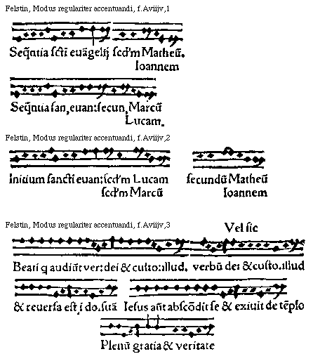 [Felstin, Modus regulariter accentuandi, f.Aviijv,3; text: Beati qui audiunt verbum dei et cultodiunt illud. Vel sic: verbum dei et custodiunt illud, Et reuersa est in domum suam. Iesus autem abscondit se et exiuit de templo. Plenum gratia et veritate.]