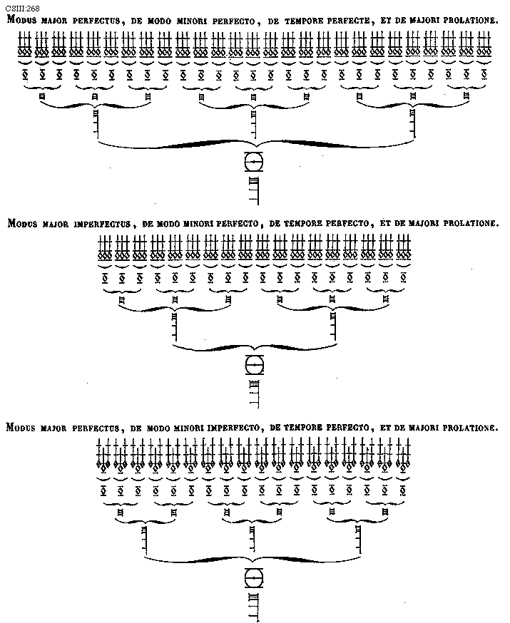 [CSIII:268; text: Modus major perfectus, de modo minori perfecto, de tempore perfecte, et de majori prolatione. Modus major imperfectus, de modo minori perfecto, de tempore perfecto, et de majori prolatione. Modus major perfectus, de modo minori imperfecto, de tempore perfecto, et de majori prolatione.]