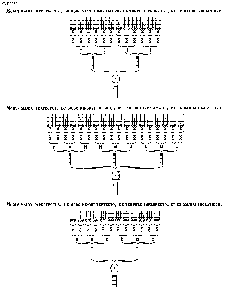 [269][CSIII:269; text: Modus major imperfectus, de modo minori imperfecto, de tempore perfecto, et de majori prolatione. Modus major perfectus, de modo minori perfecto, de tempore imperfecto, et de majori prolatione. Modus major imperfectus, de modo minori perfecto, de tempore imperfecto, et de majori prolatione.]