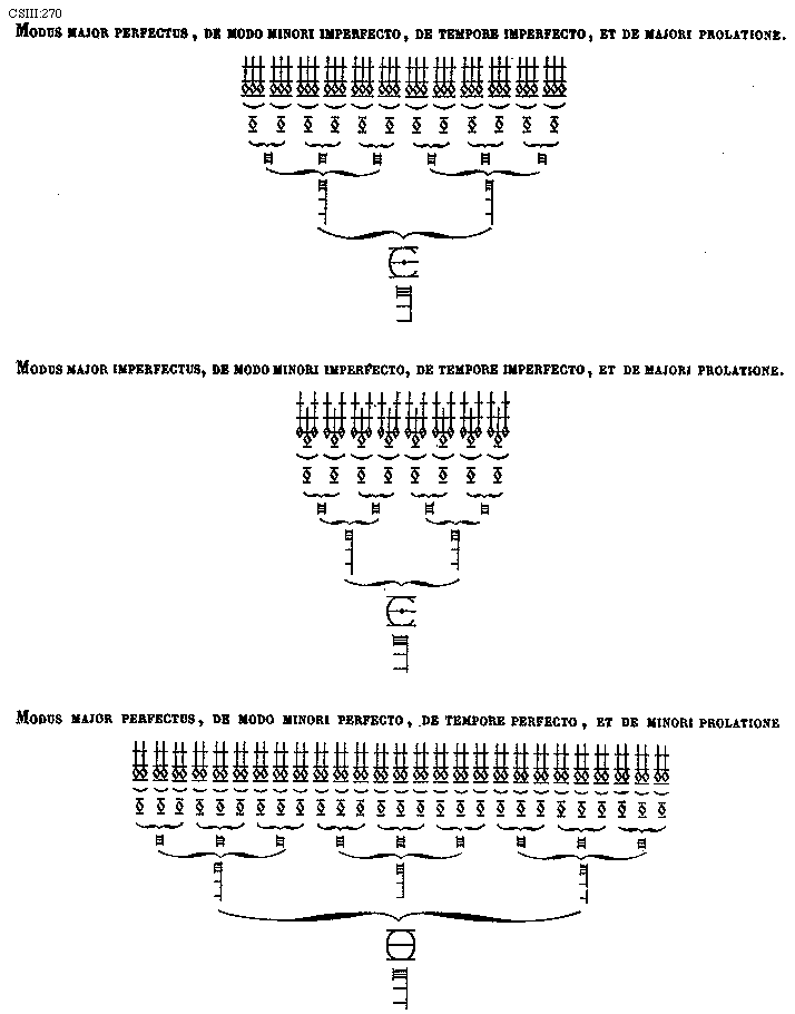 [270][CSIII:270; text; Modus major perfectus, de modo minori imperfecto, de tempore imperfecto, et de majori prolatione. Modus major imperfectus, de modo minori imperfecto, de tempore imperfecto, et de majori prolatione. Modus major perfectus, de modo minori perfecto, de tempore perfecto, et de minori prolatione.]