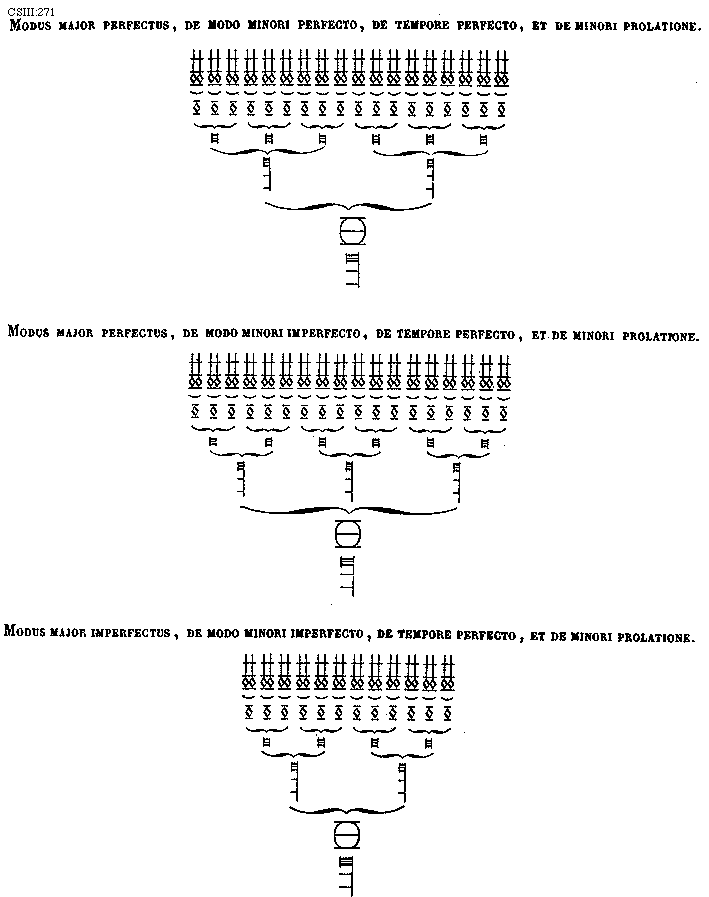 [271][CSIII:271; text: Modus major perfectus, de modo minori perfecto, de tempore perfecto, et de minori prolatione. Modus major perfectus, de modo minori imperfecto, de tempore perfecto, et de minori prolatione. Modus major imperfectus, de modo minori imperfecto, de tempore perfecto, et de minori prolatione.]