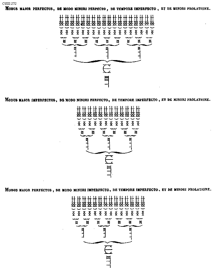 [272][CSIII:272; Modus major perfectus, de modo minori perfecto, de tempore imperfecto, et de minori prolatione. Modus major imperfectus, de modo minori perfecto, de tempore imperfecto, et de minori prolatione. Modus major perfectus, de modo minori imperfecto, de tempore imperfecto, et de minori prolatione.]