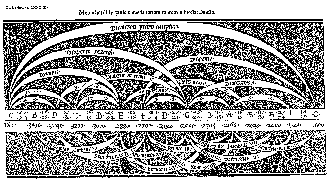 [f.XXXVIIIr][Musica theorica, f.XXXVIIIr; text: A sensu perceptibilis monochordi diuisio. Tertio per 25, 15, Remissum, Tertiodecimo per 3, 2, Remissum, Quinto per 3, 2, Remissum, Quarto per 5, 4, Remissum, Secto per 18, 15, Remissum, Nono per 5, 4, Remissum, Chorda Quindecim partium primo et libere inuenta, c, b, dd, e, f, g, a, [sqb], k, Decimo per 4, 3, intensum, Septimo per 9, 8, Remissum, Quartodecimo per 4, 3, intensum, Septimo per 3, 2, remissum, sexto per 4, 3, intensum, octauo per 3, 2, Remissum, Quintodecimo per 8, 5, intensum, vndecimo per 2, 1, intensum]