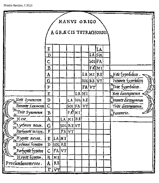 [f.XLIr][Musica theorica, f.XLIr; text: Manvs origo a graecis tetrachordis, E la, D la sol, C sol fa, B fa[sqb] mi, A la mi re, G sol re vt, F fa vt, E la mi, D la sol re, C sol fa vt, B fa[sqb]mi, A la mi re, G sol re vt, F fa vt, E la mi, D sol re, C fa vt, [sqb] mi, A re, [Gamma] vt, Tetrachordum, Nete Synemenon, Tonus, Paranete Synemenon, Trite Synemenon, Semitonium, Mese. Lychanos meson. Parhypate meson. Hypate meson. Lychanos hypaton, Parhypate hypaton, Hypate hypaton. Proslambanomenos. Nete hyperboleon, Paranete hyperboleon, Paranete hyperboleon, Trite hyperboleon. Nete diezeugmenon, Paranete diezeugmenon, Trite diezeugmenon, Paramese.]