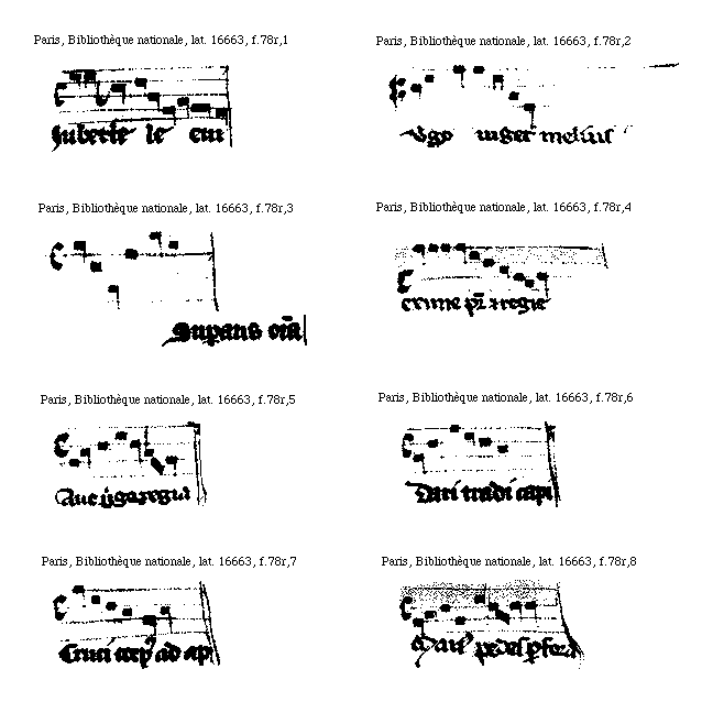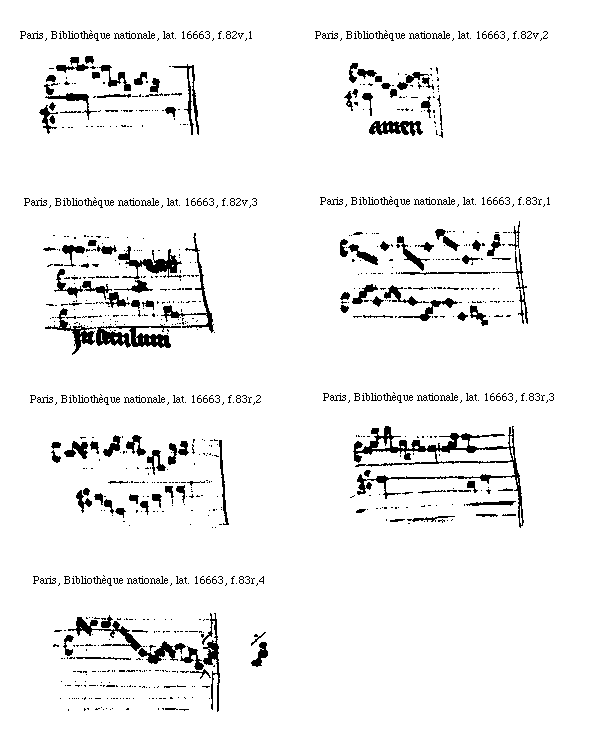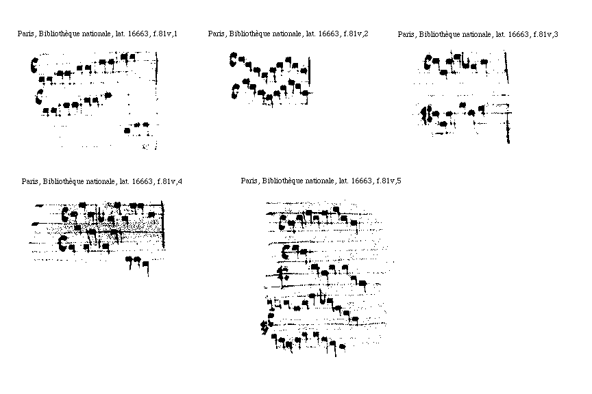 [Paris, Bibliotheque nationale, lat. 16663, f.82r,1; text: uirgo dei plena, amoris. aut in diapason ut hic. Arida frondescit, Iohanne. aut in diapente Aut in diatesseron. O Maria mater dei, flos filius, Mulier omnis peccati, Omnes, Recordare uirgo mater, aut in ditono: ut hic, portare, aut in semiditono ut hic. uirgo uiget melius]