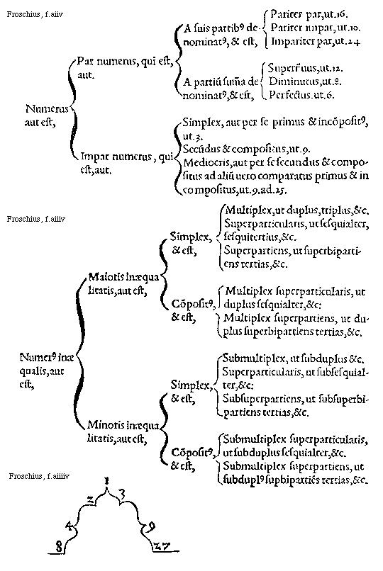 [De reliquis tribus mensurae proportionibus. Boaetius 2. caput 5. Boaetius 2. caput 20.] Iam et multiplicitatis ab unitate manantis augmenta, supparticularitatis a binario incipientis diminutioni, authore Boaetio, respondent. Porro quum non possit esse duplum praeter dimidium, nec triplum praeter tertiam partem, hinc est, ut ternarius, qui ad unitatem comparatus, primus triplus est, ad binarium fit primus quoque sesquialter, et quaternarius, qui primus quadruplus, fit primus sesquitertius. Itaque triplus sesquialtero, et quadruplus sesquitercio rite opponitur. Differentias autem, qua proportiones huiusmodi differunt, nempe unitatem et binarium, auris Geometrica ratione ad tactum potest explorare, non item alias aliarum proportionum differentias.