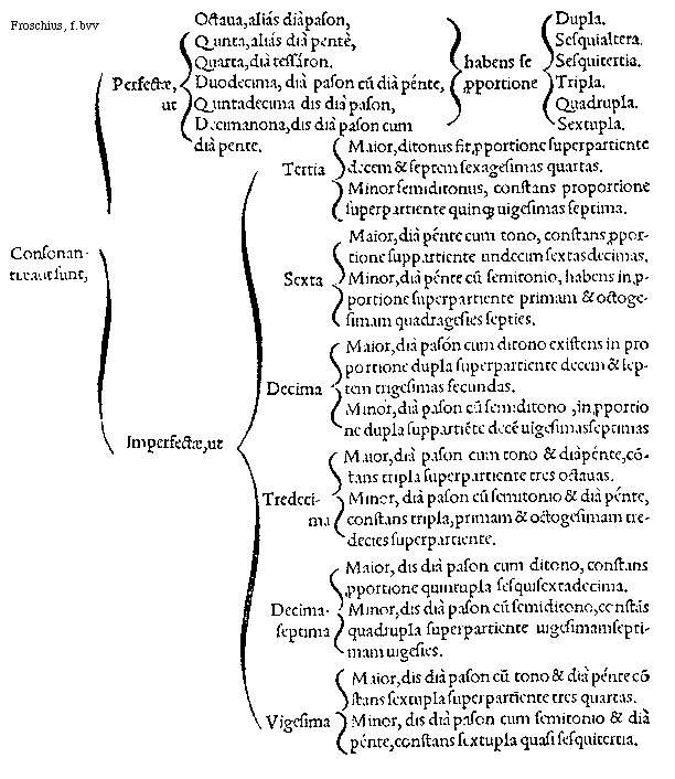 [f.dviv]perfectis uel imperfectis, meddis committantur, ratione infra sequenti. Nam ternae uoces frequenter dupla, sesquialtera, et sesquitertia proportionibus habeant hoc est, octaua, quinta et quarta conueniant. Quaternae, octaua, quinta, quarta, et quintadecima. Senariae uero uoces, octaua, quinta, quarta, decima, duodecima, et quintadecima disponantur.