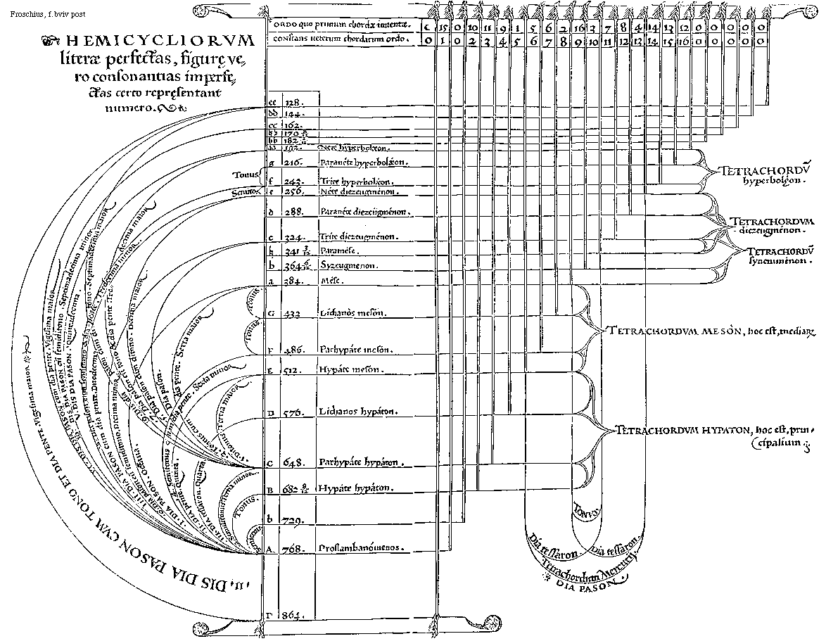 [Supra. Capite septimo, Macrobius 2. caput 2 in marg.] Caeterum quibus consonantiis mediis, et uelut ansulis perfectae, perfectis eo quo dictum est modo, committendae fuerint, ex iis, que supra capite septimo e Macrobio prolata sunt, colligi potest: quemadmodum enim hiantia inter duplos et triplos, spacia, insertis partibus impleantur, binis medietatibus singula spacia colligantibus, indeque hemiolii, epitriti, et epogdoi, climmata nascantur, hoc loci pro instituti ratione, non tam uerbis explicare, quam oculis subiicere, atque auribus explorare licet: id quod ex parte quidem bifariam demonstrandum, infra proponere conabimur.