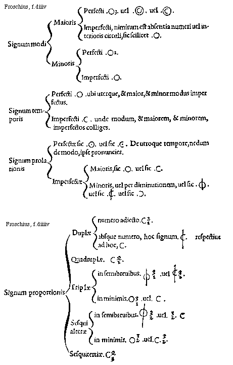 [f.diiiv][Froschius, f.diiiv; text: Signum modi, Signum temporis, Signum prolationis, Maioris, Minoris, Perfecti .[O]. ubi uterque, et maior, et minor modus imperfectus. Imperfecti .[C]. unde modum, et maiorem, et minorem, imperfectos colliges. Perfectae sic .[Od]. uel sic .[Cd]. De utroque tempore, nedum de modo, ipse pronuncies. Imperfectae. Perfecti .[O3]. uel, Imperfecti, nimirum est absentia numeri uel interioris circuli, sic scilicet .[O]. Perfecti .[O2]. Imperfecti .[O]. Maioris, sic .[O]. uel sic .[C]. Minoris, uel per diminutionem, uel sic .[Odim]. uel sic .[Cdim]. uel sic .[CL].]