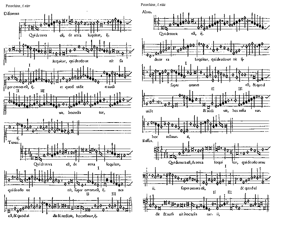 [Froschius, f.eiiv; text: Discantus, Qui de terra est, de terra loquitur. loquitur, qui de celo uenit super omnes est, et quod uidit et audiuit, hoc testatur, ij. I, II, III, Tenor.]