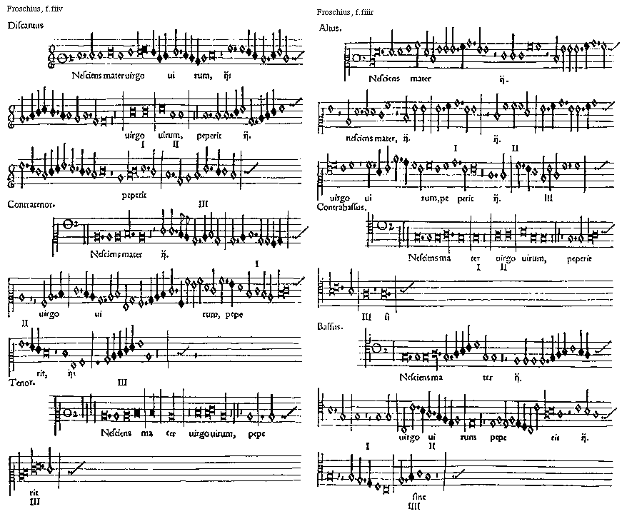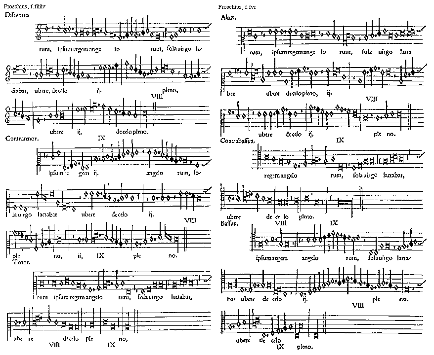 [Froschius, f.fiiiiv; text: Discantus, seculorum, ipsum regem angelorum, sola uirgo lactabat, ubere, de celo pleno, ij. VIII, IX, Contratenor. Tenor.]
