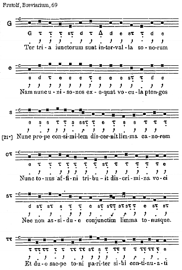 Diatessaron quae minima est consonantiarum, tres tantum habet diversas species, una minus quam voces. [I] Quarum prima constat tono, semitonio, tono, quae est A B C D id est proslambanomenos, hypate hypaton, parhypate hypaton, lichanos hypaton. [II] Secunda forma est B C D E hypate hypaton, parhypate hypaton, lichanos hypaton, hypate meson, constans semitonio et ditono. [III] Tertia species est C D E F, quod est parhypate hypaton, lichanos hypaton, hypate meson, parhypate meson, constans ditono et semitonio. Quodsi propter numerum troporum qui naturaliter quatuor sunt, quartam speciem adjicere velis, sub forma primae inter D et G illam tibi occurrere videbis ut sic: D E F G, quod est lichanos hypaton, hypate meson, parhypate meson, lichanos meson. Et sic per quaternas chordas per omnem seriem computando has alternatim formas te scias inventurum, exceptis duobus locis, scilicet inter parhypaten meson et paramesen et inter triten synemmenon et neten diezeugmenon, hoc est inter F et [sqb] quadratam et inter [rob] rotundam et e. In utrisque enim locis tritonus habetur.