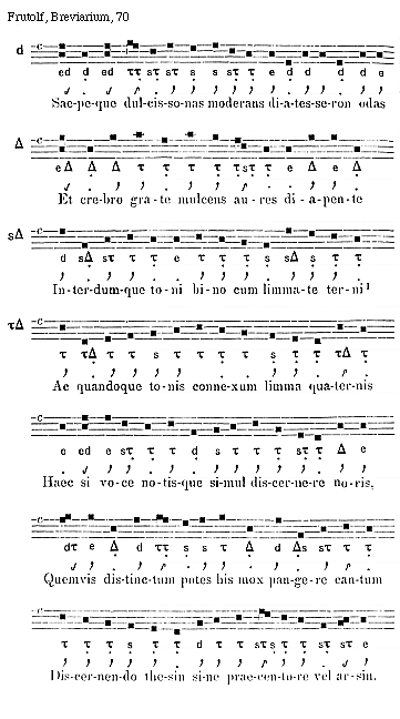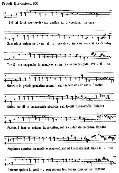 [100][Frutolf, Breviarium, 100, text: Primi toni melodiam psalles in directum. Primus, Secundum autem in fine et in medio sic variabis. Secundus, Tertium suspende in medio et in fine praecipita. Tertius, Quartus inprimis gradatim ascendit, sed tandem de alto cadit. Quartus, Quinti medietas secundo similis, sed finis dissimilis. Quintus, Sextus item ut primus imponitur, sed aliter deponitur. Sextus, Septimus quartum in medio respicit, sed ad finem despicit. Septimus, Octavus quinto in medio respondens tali tenore concluditur. Octavus]