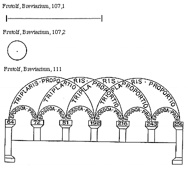 [Frutolf, Breviarium, 34; text: BISDIAPASON, DIAPASON, DIAPENTE, DIATESSARON, DUPLA PROPORTIO, TRIPLA PROPORTIO, QUADRUPLA PROPORTIO, SESQUITERTIA PROPORTIO, SESQUALTERA PROPORTIO, I, II, III, IV, TONUS]