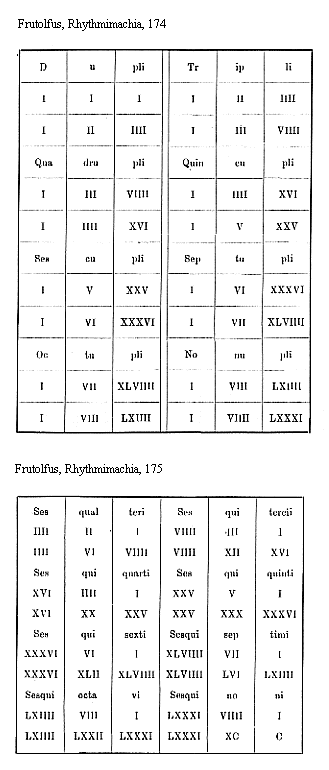 [Frutolfus, Rhythmimachia, 174; text: Dupli, Tripli, Quadrupli, Quincupli, Sescupli, Septupli, Octupli, Nonupli, I, II, III, IIII, V, VI, VII, VIII, VIIII, XVI, XXV, XXXVI, XLVIIII, LXIIII, LXXXI]