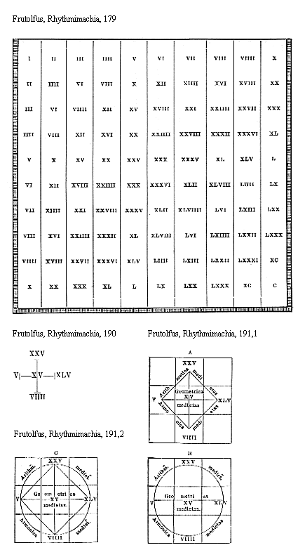 [188]hec praecepta inueniri, sed hos tantum maluimus ponere, ex quibus illi procreantur termini, qui in rithmimachiae tabula uidentur dispositi.