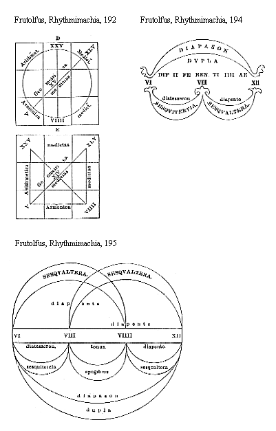 [193]quae est in musica diapente consonantia. Habet enim minorem totum et eius alteram partem. Ad XV uero dupla, que est diapason. Porro XX ad XV sesquitercia proportio est, quae est diatesseron. Habet enim minorem totum et eius terciam partem. Item IIII et VI armonici sunt, XII per praedam adquirendus est. XII ad VI dupla proportio est diapason, ad IIII tripla id est diapason diapente, VI ad IIII sesqualtera id est diapente. Item II et VI armonici sunt, III per praedam acquirendus est, VI ad III duplus id est diapason, ad II triplus id est diapason diapente, III ad II sesqualtera id est diapente. Item XXV et XLV armonici sunt, CCXXV per praedam acquirendus est. In his tamen terminis consonantiae non inueniuntur, nisi tantum proprietas [2] armonice medietatis. In ea uero parte, ubi tercurta piramis est CXC, armonici sunt III et V, XV per praedam adquirendus est. Item V et VIIII armonici sunt, XLV per praedam adquirendus est. Item XXVIII et VII armonici sunt, IIII per praedam adquirendus est. In quorum omnium dispositione eadem ratio armonice proprietatis, quae superius praelibata est, diligenter consideranti aperitur, preter quod musice consonantie non adeo ibi inueniuntur, quia maxime in superpartienti proportione constituti sunt, quae sicut dicit Boetius ab armoniae continentia separatur; a Ptolomeo tamen recipitur, cuius de hac sentenciam qui nosse desiderat Boetii de musica tractatum perlegat. Predictos quoque utriusque partis terminos sic uariare potes, ut per arithmeticam seu geometricam proprietatem dispositi musicis quoque proportionibus uictoriam perficiant. Exempli gratia: Statue VII, VIII, VIIII siue VI, VIIII, XII uel VIIII, XII, XV et habebis arithmeticam medietatem et non nullas musicas consonantias. Ad geometricam uero medietatem disponendam pone IIII, VIII, XVI siue V, XV, XLV uel IIII, XVI, LXIIII, et in his musicam quoque non deesse perspicies. Hac tantummodo ratione utramque medietatem discernes, ut in arithmetica equales sint differentiae, in geometrica uero equali inter se termini proportione iungantur.