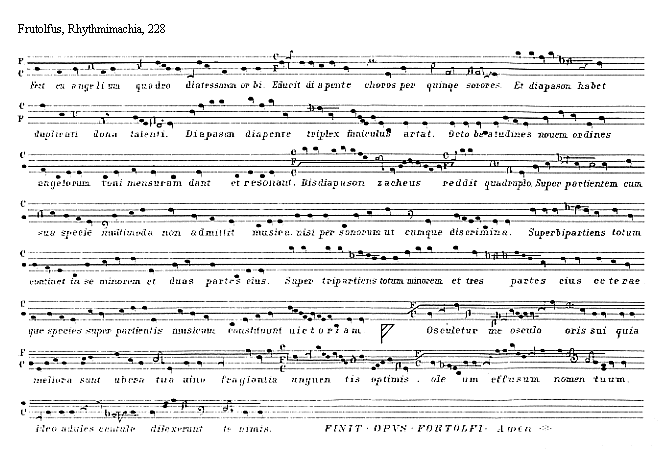 [196]Quia uero in facienda uictoria aliqui disponuntur termini ex genere superpartienti, in quibus musicae proportiones non possunt inueniri, sicut supra praelibauimus, non inutile arbitror ostendere, quomodo et in ipsis utcumque terminis musica quoque speculatio deesse non possit. Dicit domnus Wido in micrologo suo talem distributionem neumarum in componendo cantu obseruandam, ut cum neumae tum eiusdem soni repercussione, tum duorum aut plurium connexione fiant, semper tamen aut in numero uocum aut in ratione tonorum ipse neumae alterutrum conferantur atque respondeant, nunc aequae aequis, nunc duplae uel triplae simplicibus, atque alias collatione sesqualtera uel sesquitercia. Cum per has quidem proportiones diuisio disponatur monocordi, hic tamen intendit ostendere, quod sicut in monocordo istis mensuris praedictae consonantiae colliguntur, ita in armonia neumae, quae non nisi ipsis consonantiis fiunt, etiam ipsis praecipue proportionibus consonent [2] et conferantur. Sicut ergo ille proportiones per diuersos numeros diuerse sibi conferuntur, sic in cantibus secundum diuersos numeros sonorum non consonantiarum diuersitatem uidere possumus proportionum. Vnde et numeros sonorum, seu consonantia sit seu non sit, ita considerare possumus, ut cum habeant duplam, sesqualteram uel sesquiterciam proportionem, etiam inuenire possimus triplam, quadruplam et quincuplam ac deinceps, superbipartientem quoque et supertripartientem seu superquadripartientem ac deinceps, sicque fiat, ut ex genere superpartienti constituta uictoria musica quoque ibi non desit per proportiones tantum sonorum, non consonantiarum. Quod ut exemplo manifestius fiat, quasdam symphonias secundum has sonorum proportiones compositas subiecimus.
