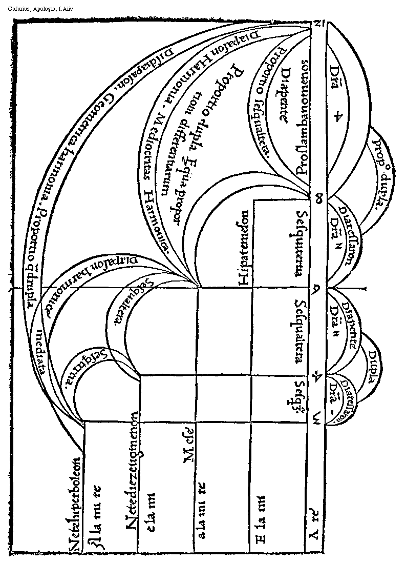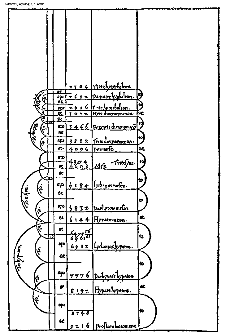 [f.Aiiv][Gafurius, Apologia, f.Aiiv; text: Netehiperboleon, A la mi re, Netediezeugmenon, e la mi, Mese, a la mi re, Hipatemeson, E la mi, Proslambanomenos, A re, 3, 4, 6, 8, 12, Differentia, Proportio dupla. Diatessaron. 2, Diapente, Dupla, 1, Sesquitertia, Sesqualtera, Proportio sesqualtera. Proportio dupla AEqua proportioni differentiarum, Diapason Harmonia, Mediocritas Harmonica, Diapason harmonice mediata, Disdiapason, Geometrica harmonia, Proportio quadrupla]