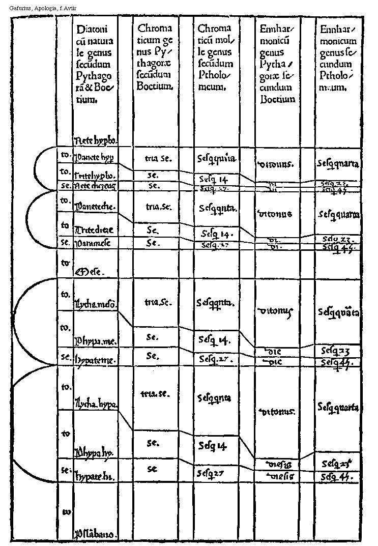[f.Aviir][Gafurius, Apologia, f.Aviir; text: Diatonicum naturale genus secundum Pythagoram et Boetium. Chromaticum genus Pythagorae secundum Boetium. Chromaticum molle genus secundum Ptholomeum. Ennharmonicum genus Pythagorae secundum Boetium, Ennharmonicum genus secundum Ptholomeum. tonus, semitonium, Nete hyperboleon, Paranete hyperboleon, Trite hyperboleon, Nete diezeugmenon, Paranete diezeugmenon, Trite diezeugmenon, Paramese, Mese, Lychanos meson, Parhypate meson, Hypate meson, Lychanos hypaton, Parhypate hypaton, Hypate hypaton, Proslambonomenos, tria semitonia, sesquiquinta, sesquidecimaquarta, sesquiuigesimaseptima, ditonus, diesis, sesquiquarta, sesquiuigesimatertia, sesquiquadragesimaquinta]