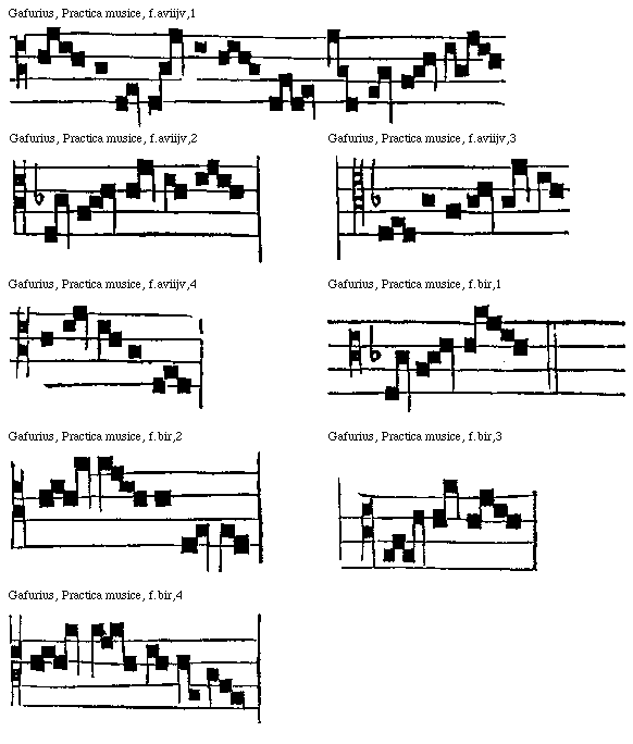 [Gafurius, Practica musice, f.bviijr,2; text: Gloria patri et filio et spiritui sancto.]