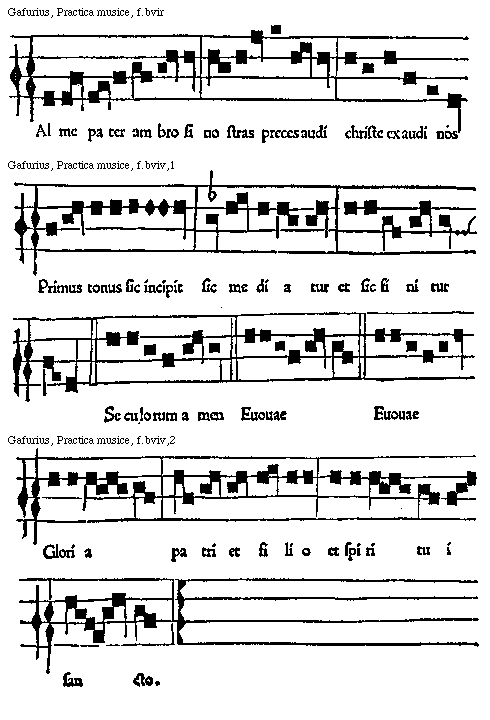 [Gafurius, Practica musice, f.bvir; text: Alme pater ambrosi nostras preces audi christe exaudi nos.]