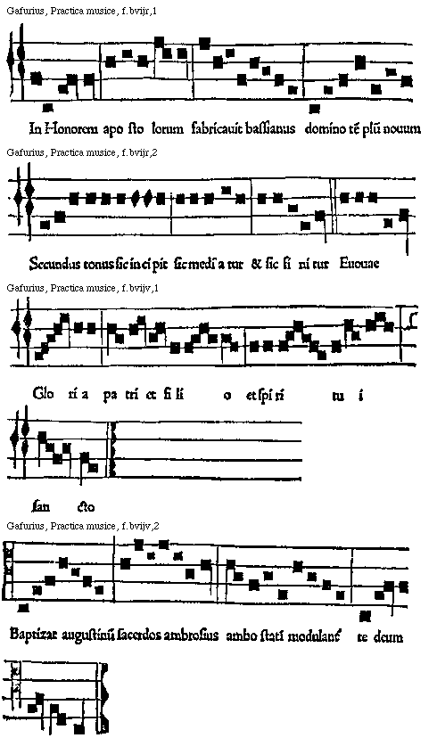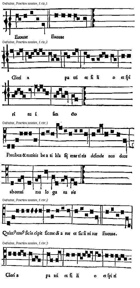 [Gafurius, Practica musice, f.bviv,2; text: Gloria patri et filio et spiritui sancto.]