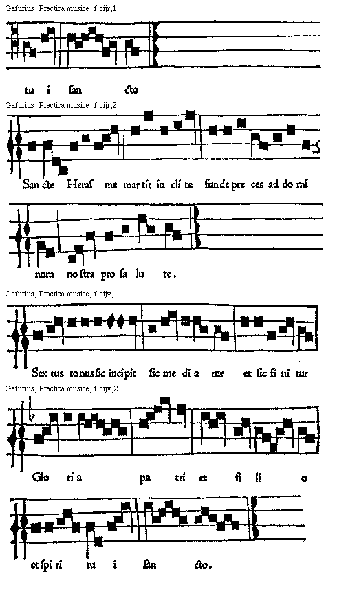 [f.cijv]est. Cuius psalmodia incipitur in vnisono procedens his syllabis fa sol la; vt hic. [Gafurius, Practica musice, f.cijv,1; text: Sextus tonus sic incipt mediatur et finitur]
