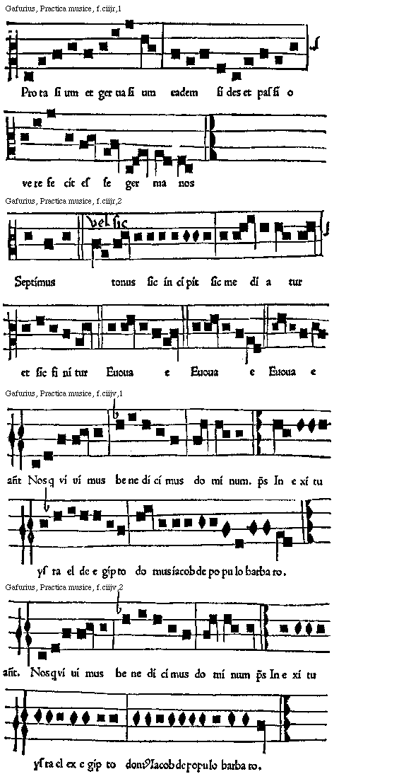 [f.ciiijr]Hanc tamen primitus antiphonam a divo Ambrosio proprijs septimi toni clauibus ductam. vbi et septimam diapason figuram et ipsum mixolydium demonstrat. videlicet in Gsolreut grauem: et Dlasolre propria confinali (quod plurimum in auctenticis instituit) terminatam fuisse: vetustissimus antiphonarum liber mihi propalavit: vt hoc notatur processu. [Gafurius, Practica musice, f.ciiijr,1; text: antiphon Nos qui vivimus benedicimus dominum psalm In exitu ysrael ex egipto domus Iacob de populo barbaro]