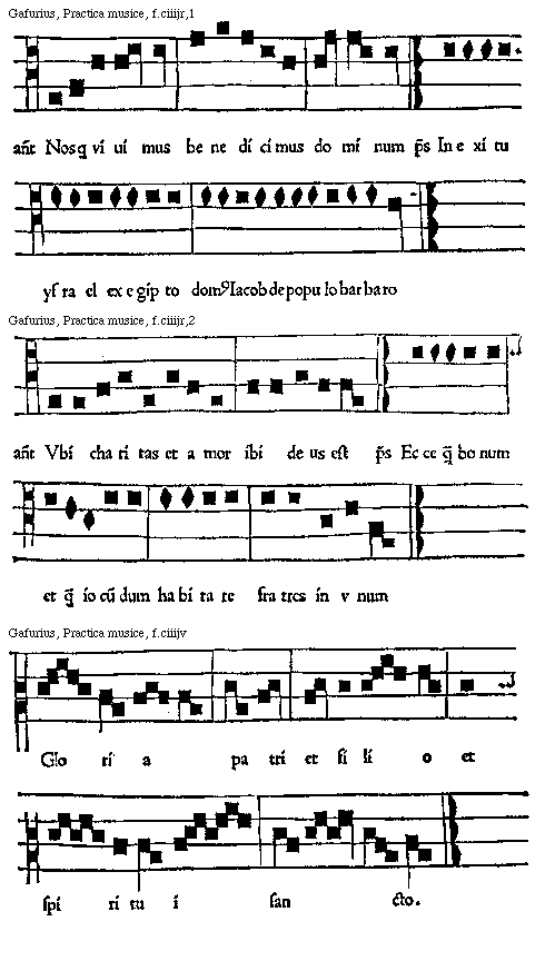 [Gafurius, Practica musice, f.ciiijv; text: Gloria patri et filio et spiritui sancto.]