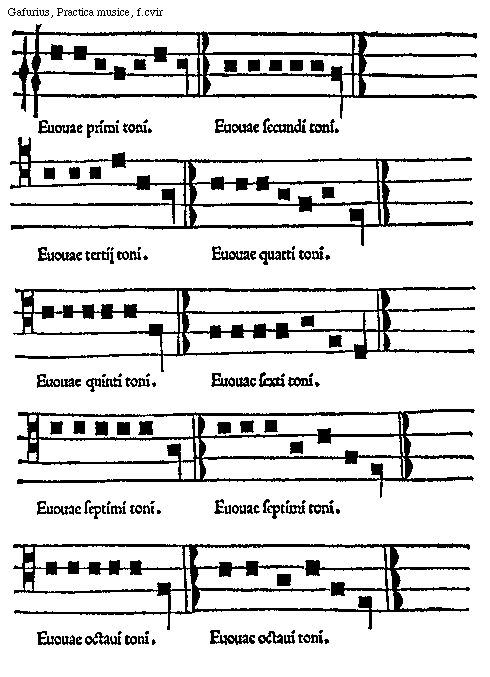 [f.cvir][Gafurius, Practica musice, f.cvir; text: Euouae primi toni secundi tertij, quarti quinti sexti septimi octaui.]