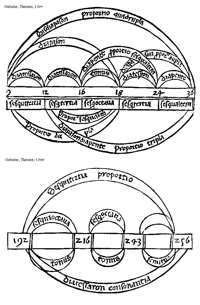 [Gafurius, Theorica, f.giir; text: A. diesis. B. C. D. E. coma, F. Semitonium Minus, Semitonium Maius, TONUS.]