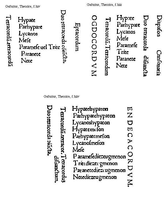 [f.hiiv]sit per tonum a Paramese: Ipsum tertium tetracordum dictum est disiunctarum cum superpositione diezeugmenon hoc modo: Paramesediezeugmenon: Tritediezeugmenon: Paranetediezeugmenon Netediezeugmenon: Quorum quidem trium tetracordorum dispositionem huius Endecacordi descriptio apertissime conducit.