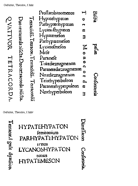 [f.hiiiv][Gafurius, Theorica, f.hiiiv; text: HYPATEHYPATON, PARHYPATEHYPATON, LYCANOSHYPATON, HYPATEMESON, semitonium, tonus, Diatessaron Consonantia. Tetracordum in genere dyatonico.]