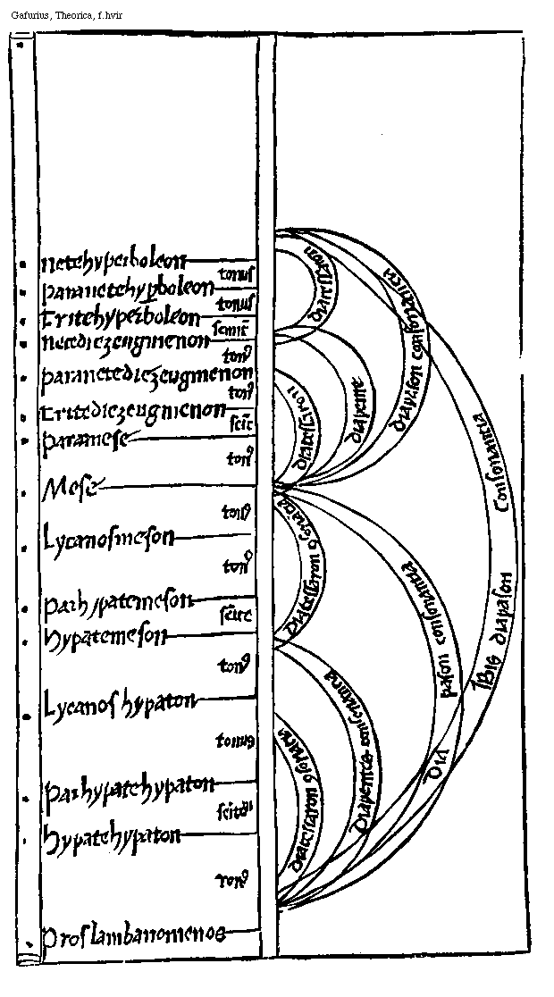 [Gafurius, Theorica, f.hivv,1; text: HYPATEHYPATON, PARHYPATEHYPATON, LYCANOSHYPATON, HYPATEMESON, semitonium minus, semitonium maius, semidyttonus, Ditessaron Consonantia, Tetracordum in genere chromatico.]