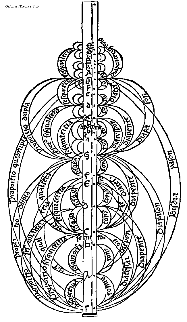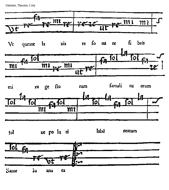 His igitur ita dispositis uiginti cordis cum duabus scilicet extremis postremo conductis hac graeca littera uidelicet [Gamma] quam gamma dicunt: nos uero pro g littera consideramus et ea quam acutioribus superposuerunt cordis hoc modo sculptam ee Guido ille monacus aretinus diuina quodammodo inspiratione ductus: [Guido in marg.] deuote examinans Hymnum sactissimi precusoris Ioannis Baptistae primas eius rythmi capitales sillabas perpendit a se inuicem eis ipsis interuallis distare quibus dispositae fuerant in monocordo Philosophorum cordae. hinc acuratiori examine tonum inter primam primi rithmi sillabam quae est ut et primam secundi quae est re: atque hanc inter et primam tertii quae est mi pariter tonum consistere percepit. Verum ab hac prima tertii primam quarti scilicet fa solo minore semitonio intentam esse. hanc uero a prima quinti quae eam