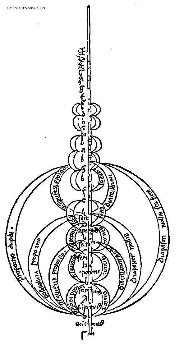 [Gafurius, Theorica, f.kiiiir; text: tonus, semitonium, A, [sqb], C, D, E, F, G, a, hypodorius, hypophrigius, hypolidius, dorius, phrigius, Lidius, Mixolidius, hypermixolidius]