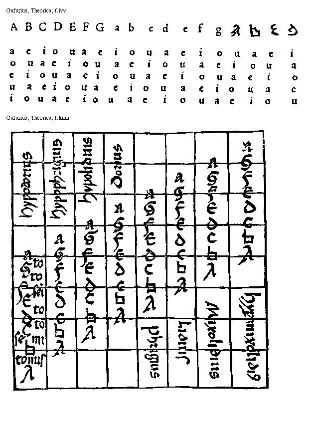 [Gafurius, Theorica, f.ivv; text: A, B, C, D, E, F, G, a, b, c, d, e, f, g, i, o, u, aa, [sqb][sqb], cc, dd]