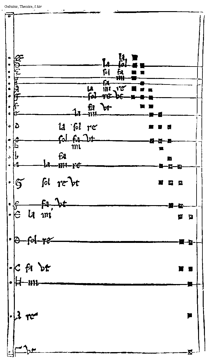 [f.kiv][Gafurius, Theorica, f.kiv; text: [Gamma] vt, A re, [sqb] mi, C fa vt, D sol re, E la mi, F fa vt, G sol re vt, a la mi re, b fa, [sqb] mi, c sol fa vt, d la sol re, e la mi, f fa vt, g sol re vt, aa la mi re, bb fa, [sqb][sqb] mi, cc sol fa, dd la sol, ee la]