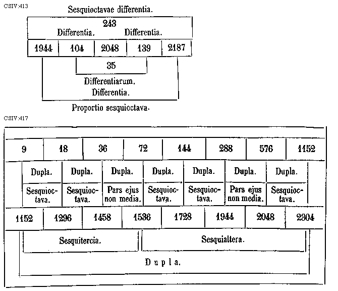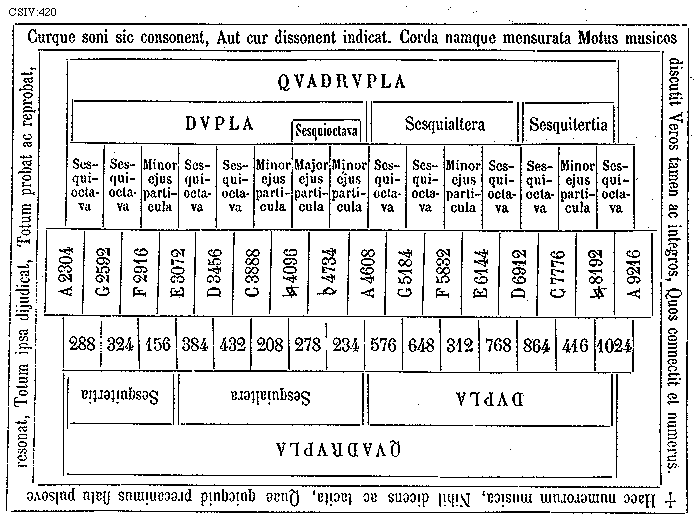 [420][CSIV:420; text: * Haec numerorum musica, Nihil dicens ac tacita, Quae quicquid precanimus flatu pulsove resonat, Totum ipsa dijudicat, Totum probat ac reprobat, Curque soni sic consonent, Aut cur dissonent indicat. Corda namque mensurata Motus musicos discutit Veros tamen ac integros, Quos connectit et numerus. Qvadrvpla, Dvpla, Sesquioctava, Sesquialtera, Sesquitertia, Minor ejus particula, Major ejus particula, A 2304, G 2592, F 2916, E 3072, D 3456, C 3888, [sqb] 4096, [rob] 4734, A 4608, G 5184, F 5832, E 6144, D 6912, C 7776, [sqb] 8192, A 9216, 288, 324, 156, 384, 432, 208, 278, 234, 576, 648, 312, 768, 864, 416, 1024]