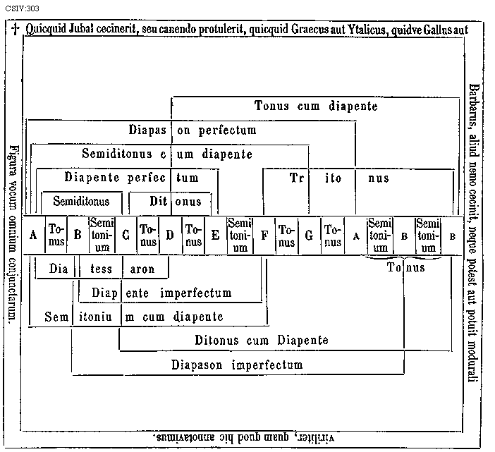 [303][CSIV:303; text: * Quicquid Jubal cecinerit, seu canendo protulerit, quicquid Graecus aut Ytalicus, quidve Gallus aut Barbarus, aliud nemo cecinit, neque potest aut potuit modurali viriliter, quam quod hic annotavimus. Figura vocum omnium conjunctarum. Tonus cum diapente, Diapason perfectum, Semiditonus cum diapente, Diapente perfectum, Tritonus, Semiditonus, Ditonus, Tonus, Semitonium, A B C D E F G, Diatessaron, Diapente imperfectum, Semitonium cum diapente, Ditonus cum diapente, Diapason imperfectum]