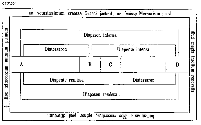 [CSIV:304; text: * Hoc tetracordum omnium primum ac vetustissimum creasse Graeci jactant, ac fecisse Mercurium; sed illud magis traditum renovatis hominibus a Noe visceribus, opinor post diluvium. Diapason intensa, Diatessaron, Diapente intensa, A B C D, Diapente remissa, Diapason remissa]